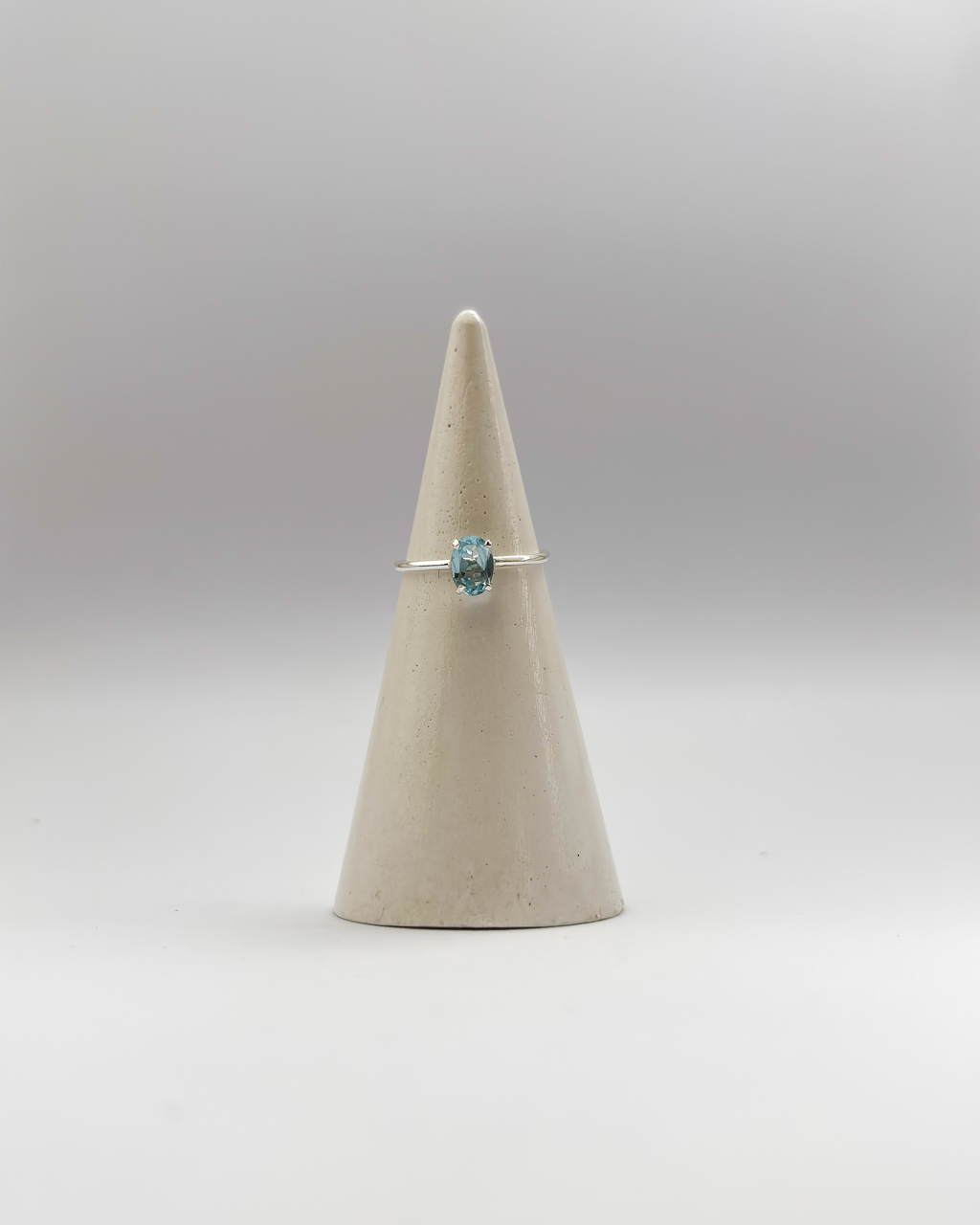 Brisa é um anel que traduz o frescor do vento leve e a serenidade das águas profundas. Com design minimalista e aro ajustável, é confeccionado em prata 925 e adornado com um topázio azul, lapidado em formato oval para revelar um brilho suave e etéreo.