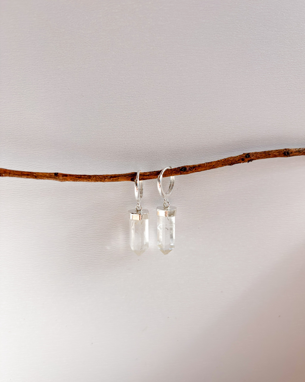 Canalize a força da clareza com o brinco Artemis em quartzo cristal. Uma argolinha modelo click em prata 925 sustenta uma ponta lapidada de cristal natural com cerca de 1,5 cm, totalizando 3 cm de pura presença.