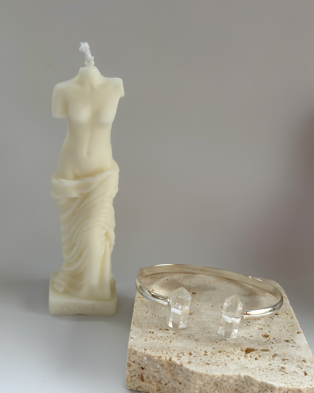 Hécate, deusa das encruzilhadas, da magia e da intuição, inspiração deste bracelete que é tão simbólico quanto poderoso. Forjado em prata 925, ele sustenta com elegância duas pedras naturais biponta de quartzo cristal, conhecida por seu alto poder de purificação, clareza mental e amplificação energética.