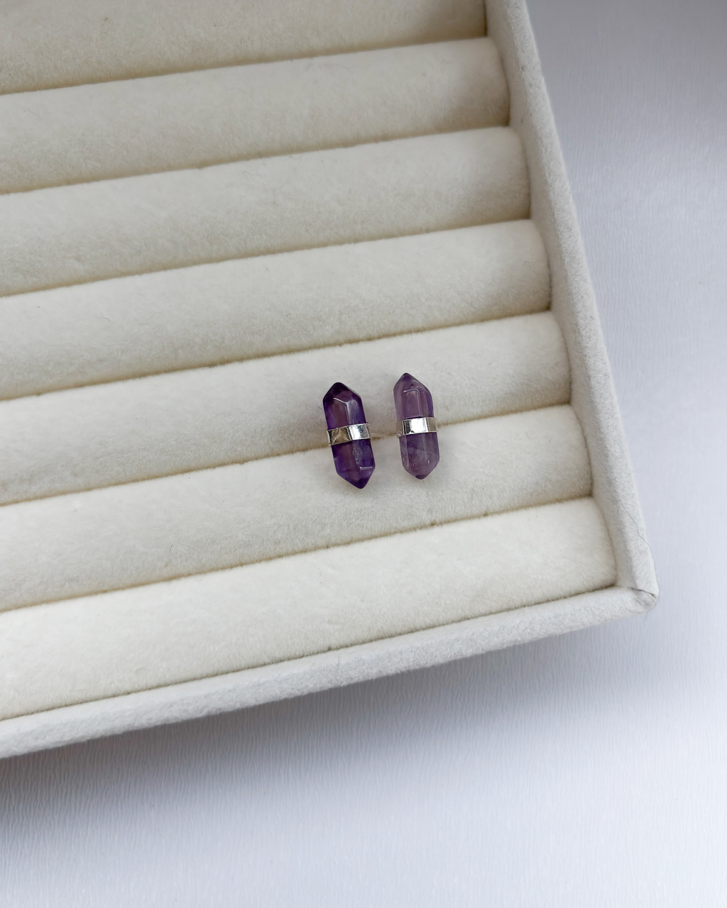 Feito em prata 925 e adornado com uma pedra biponta de ametista natural, lapidada com precisão, esse modelo tarraxa une o minimalismo à força simbólica dos cristais. A ametista é um amuleto de clareza, elevação espiritual e proteção energética. Sua tonalidade violeta traduz mistério e sabedoria interior, tocando suavemente o chakra da coroa.