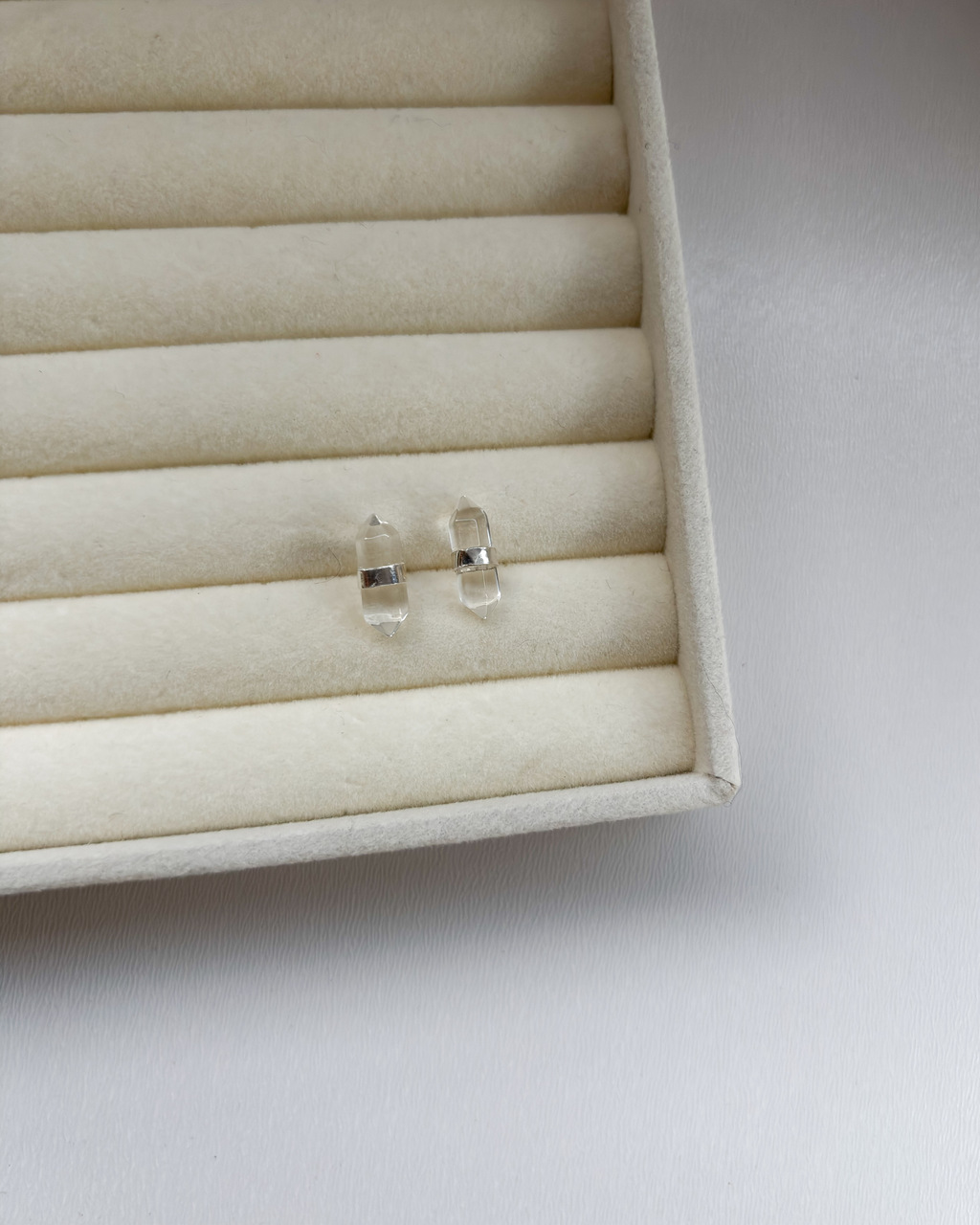 O modelo tarraxa é discreto e moderno, com uma pedra biponta de quartzo cristal natural (cerca de 1,2 cm), conhecida por purificar energias e amplificar intenções.
