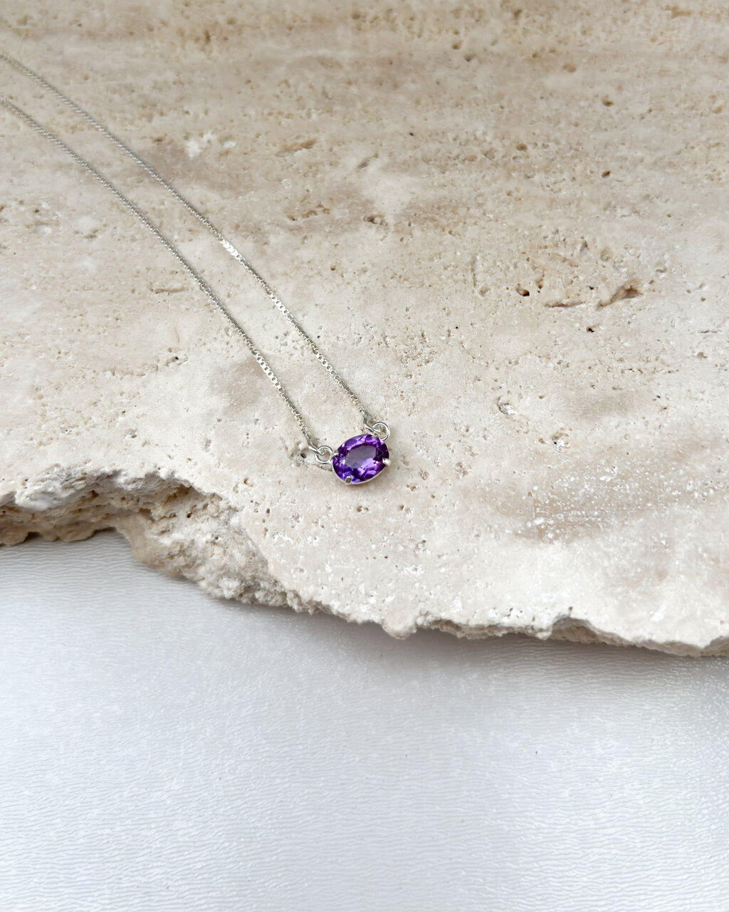 Um fio de luz para despertar a alma. O Colar Aurora Ametista é uma joia delicada e poderosa, feita em prata 925 com corrente veneziana de 45 cm. Ao centro, uma ametista natural de lapidação especial reflete nuances de violeta — como o céu na primeira luz do dia.