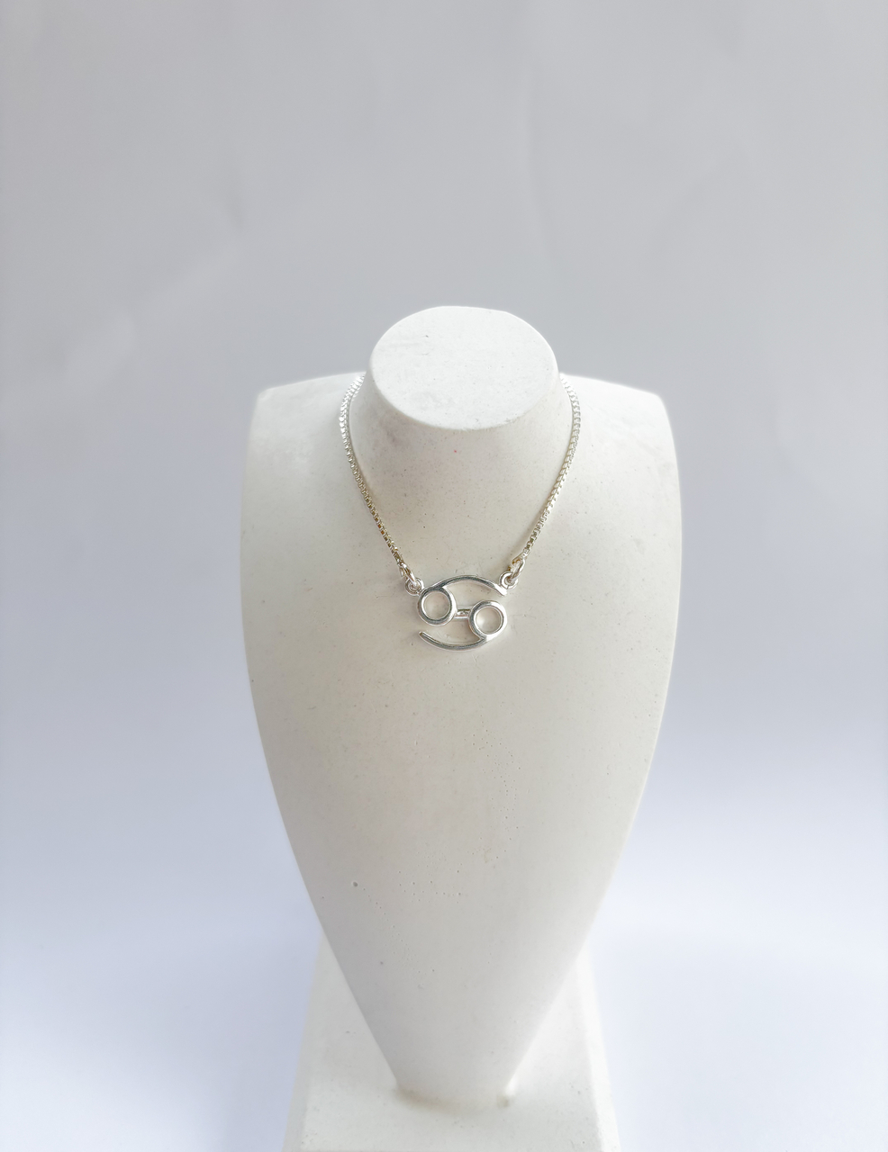 Feito em prata 925, com corrente veneziana fininha de 40 cm, ele valoriza o colo com sutileza e leveza — como um amuleto silencioso que guarda sentimentos e histórias. O símbolo de Câncer, desenhado em linhas orgânicas, reflete a proteção, a doçura e a profundidade da mulher que ama com o coração inteiro.
