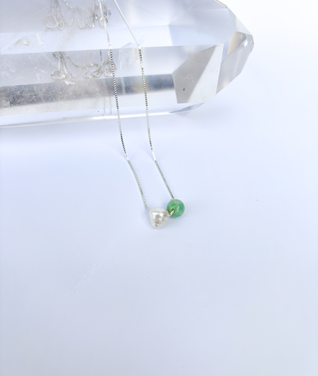O Colar Dueto simboliza o encontro entre a intuição e a calma — a união da pérola barroca, nascida das águas, com a amazonita, pedra do equilíbrio e da verdade do coração.