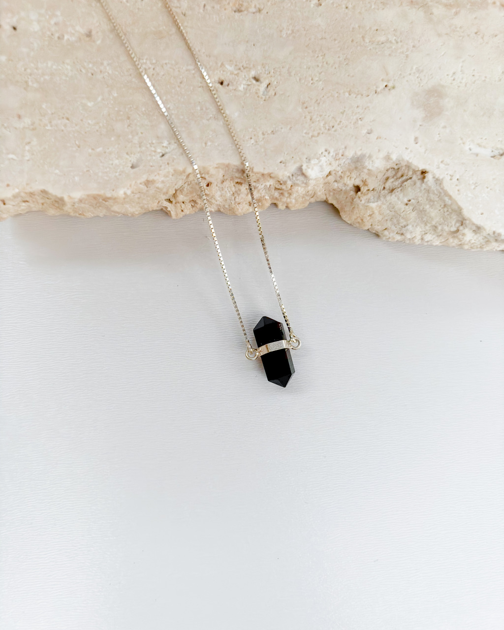 A peça conta com uma corrente veneziana de 45 cm e uma pedra natural biponta fixa, centralizada, como uma âncora de poder pessoal. A lapidação biponta canaliza e equilibra energias, tornando este colar um instrumento de conexão profunda com a força interior.
