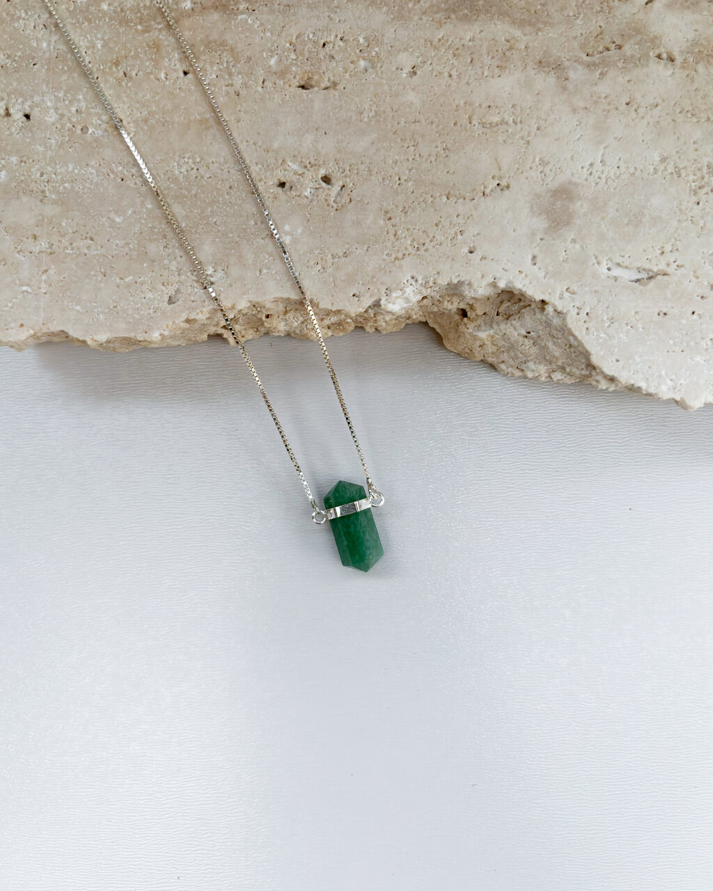 A peça conta com uma corrente veneziana de 45 cm e uma pedra natural biponta fixa, centralizada, como uma âncora de poder pessoal. A lapidação biponta canaliza e equilibra energias, tornando este colar um instrumento de conexão profunda com a força interior.