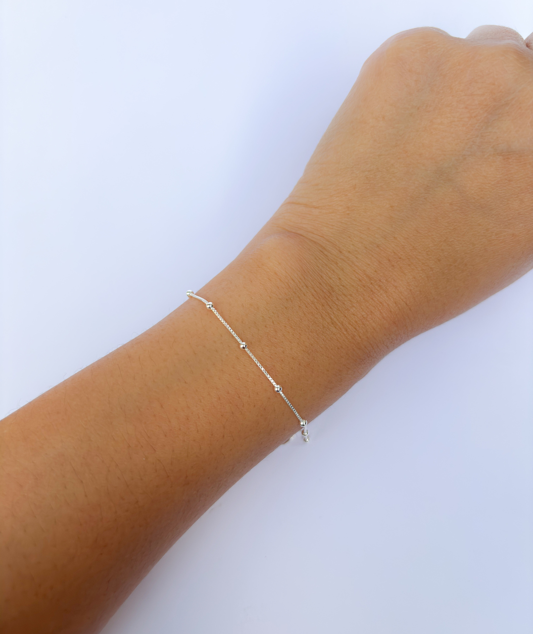 Com seu design minimalista — uma fina corrente veneziana adornada por pequenas esferas polidas —, ela reflete o brilho sutil que existe nos detalhes.
