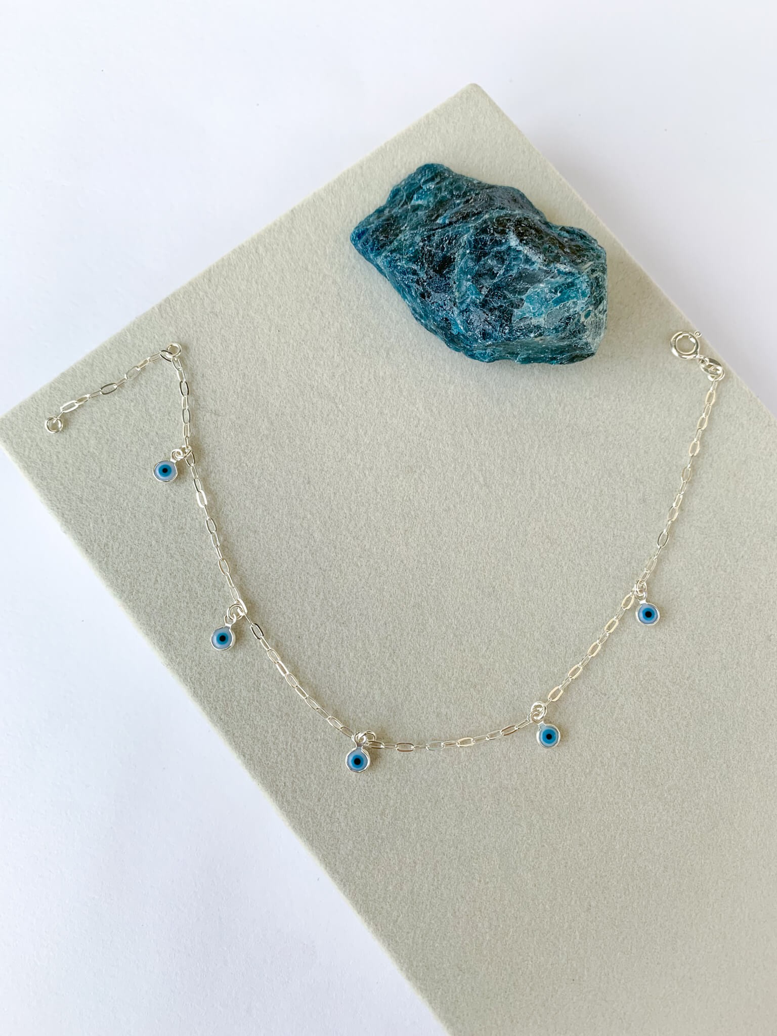 A tornozeleira Olho Grego é perfeita para isso! Feita em prata 925, a corrente possui elos ovais com lindos pingentes de olho grego, um amuleto muito conhecido por sua função de proteção e sorte.